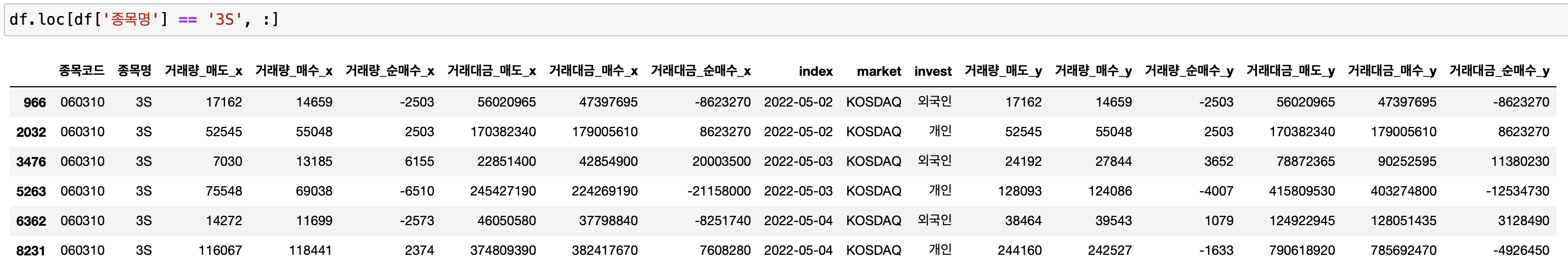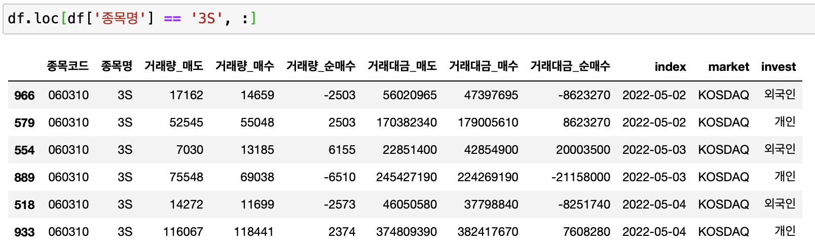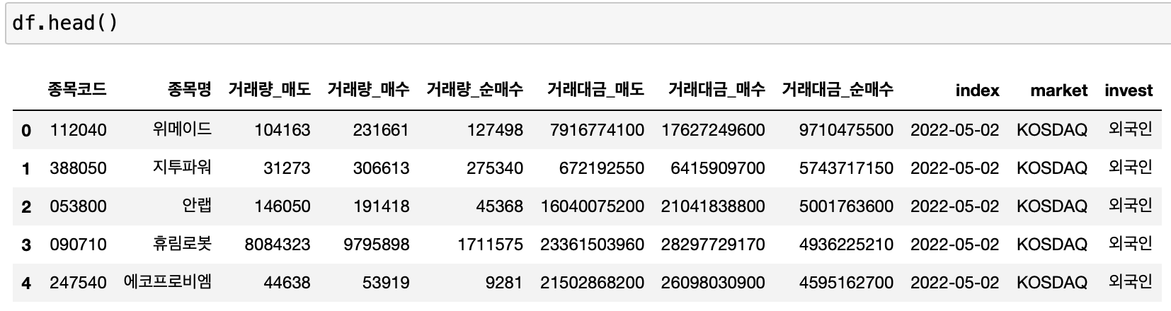 구분이 될 컬럼 값은 종목명, invest(외국인, 개인 등), market(코스피 또는 코스닥), index(일자정보) 4가지 입니다.