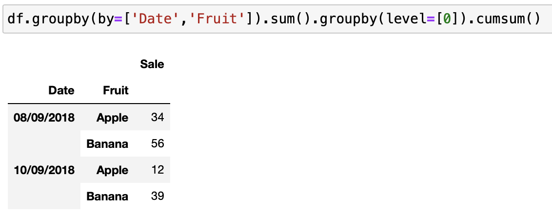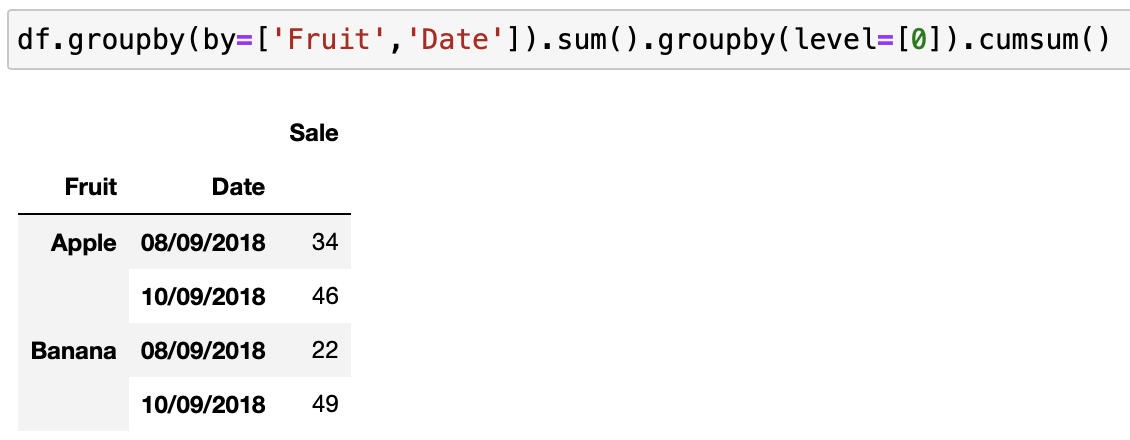 level=[0] 에 해당하는 값이 'Fruit' 이기 때문에 과일별 기준으로 판매량 그룹 누적합계를 구합니다.