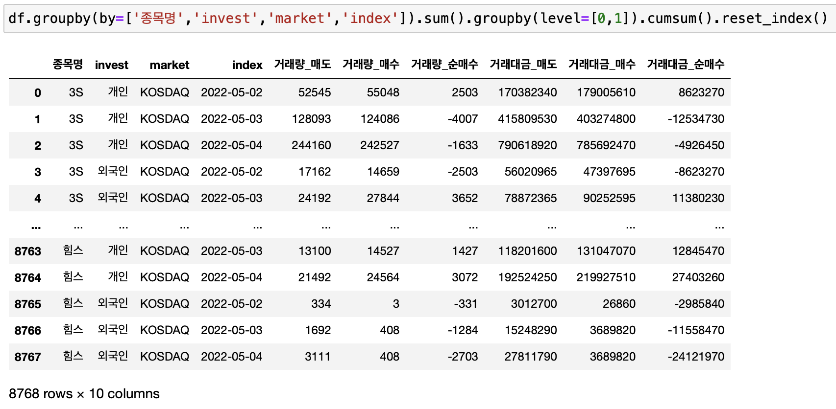위에서 그룹별 누적합계를 구했습니다. 그리고 결과값을 새로운 데이터프레임(df_cumsum)에 저장한 뒤에