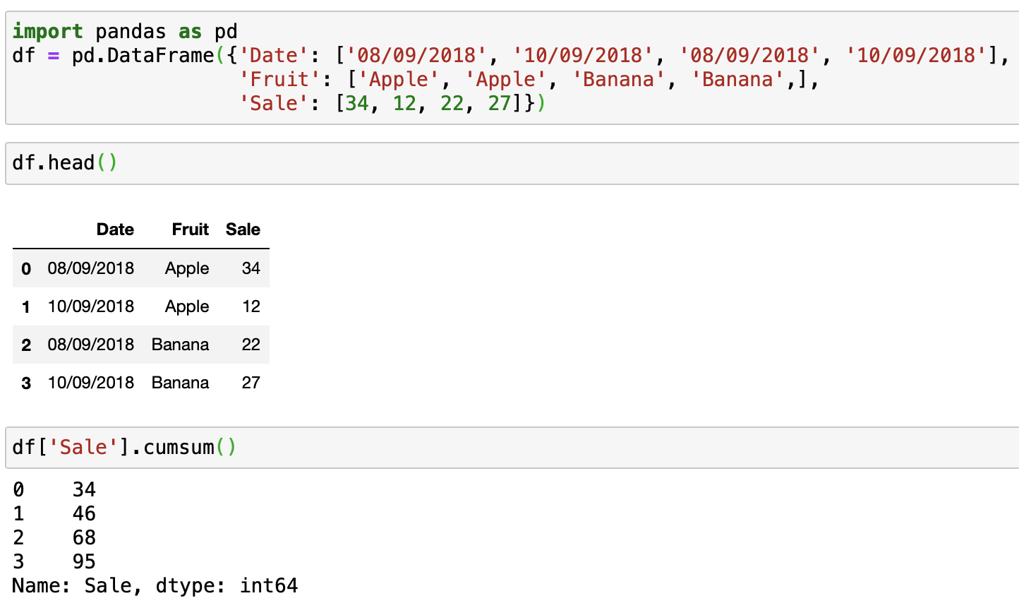 아래와 같이 날짜, 과일종류, 판매량 3개 컬럼으로 이뤄진 데이터프레임이 있습니다. 만약 판매량의 누적합을 구하고 싶다면, cumsum() 을 통해서 쉽게 구할 수 있죠.