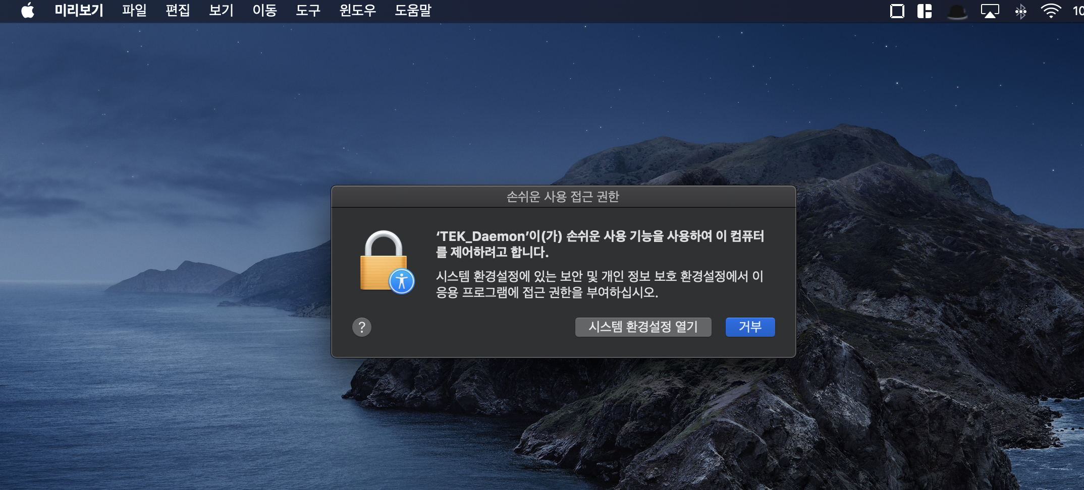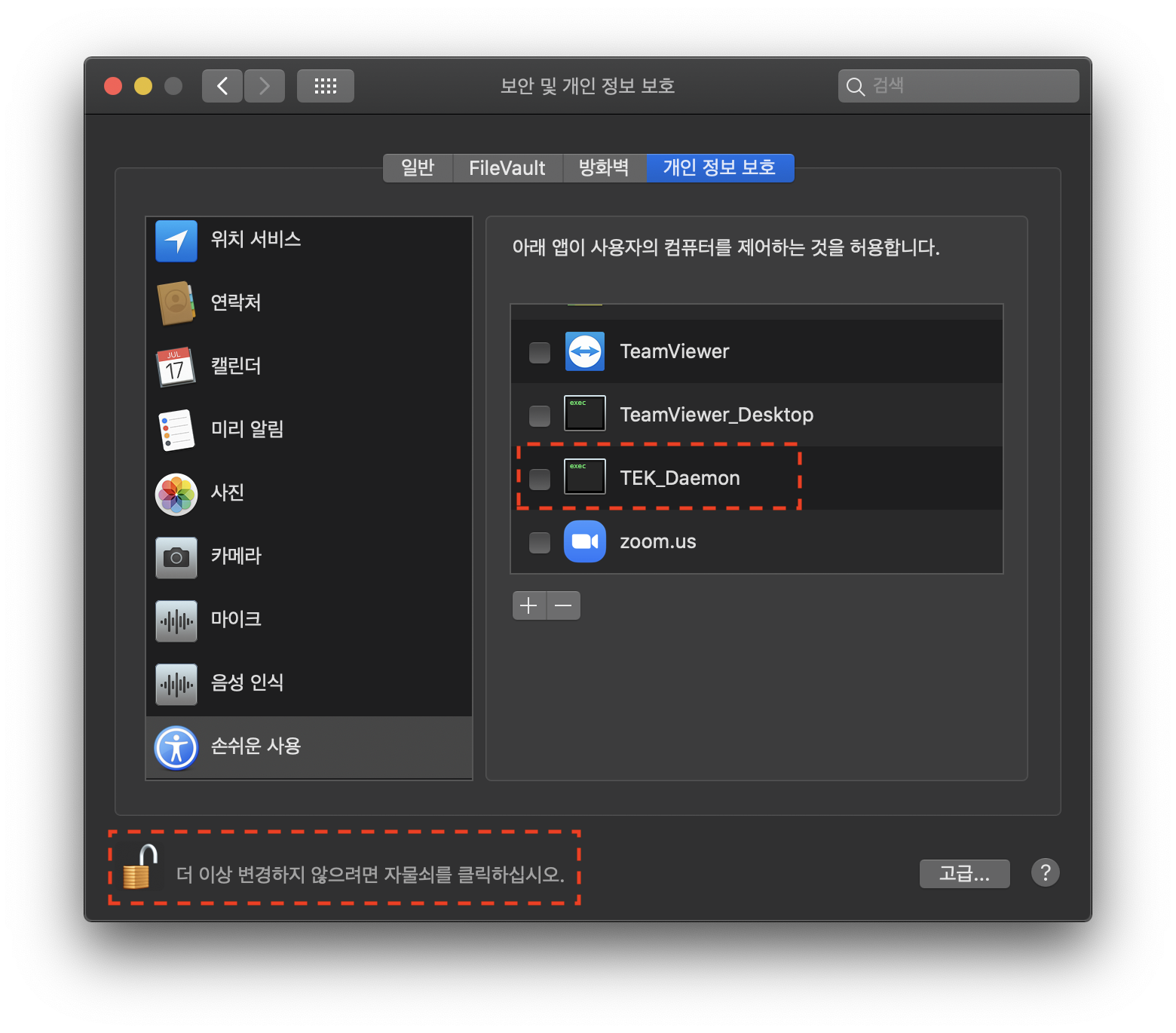 "개인정보보호"탭 (아마 디폴트) -> "손쉬운 사용"(아마 디폴트, 아니라면 선택) -> TEK_Daemon 우클릭